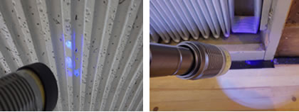 「光る検査液」が発光し雨漏経路と原因個所を特定する事ができます。